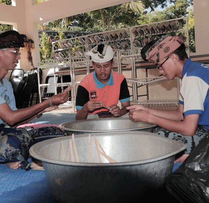 3. Mejejaitan dan membuat banten upacara persembahyangan. Sebagai sekolah yang mayoritas peserta didiknya beragama Hindu, keterampilan mejejaitan dan membuat aneka sarana upakara adalah sebuah hal yang wajib dikuasai, khususnya bagi para peserta didik perempuan. Dalam hal ini, SMK Negeri Bali Mandara membentuk tim khusus dalam bidang kerohanian yang bertugas melatih para peserta didik agar terbiasa secara mandiri dan telaten mempersiapkan sarana upacara persembahyangan. Setiap momen hari raya menjelang, tim kerohanian yang dibina oleh tenaga Guru dan Staf inilah yang akan menyiapkan segala sesuatu yang berhubungan dengan upacara persembahyangan. Dengan demikian, prinsip efisiensi dan efektifitas bisa diwujudkan, karena sekolah tidak perlu membelinya dengan menghabiskan dana yang lumayan besar.